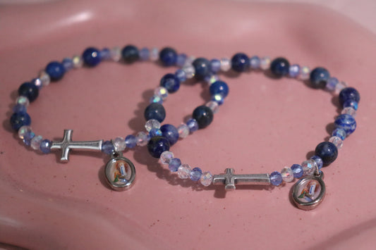 Bracelet en Pierres de Lapis Lazuli et Perles avec Croix et Pendentif de la Vierge Marie – Béni à Lourdes