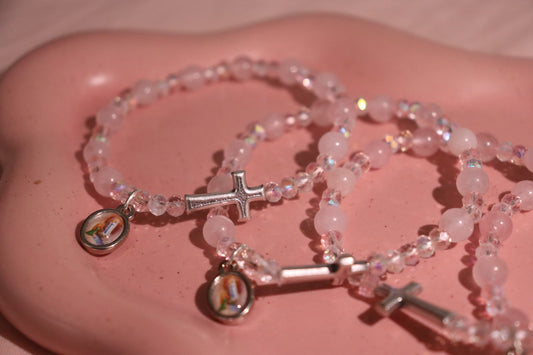 Bracelet en Pierres de Quartz Rose et Perles avec Croix et Pendentif de la Vierge Marie – Béni à Lourdes