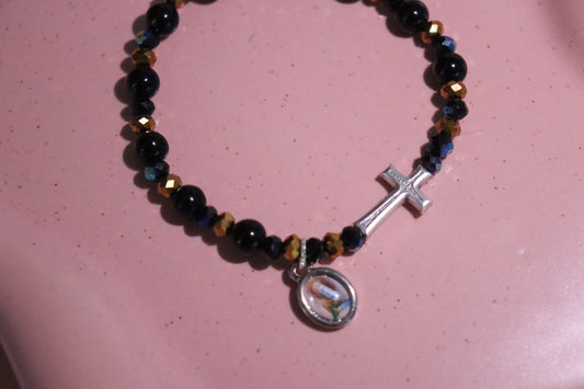 Bracelet en Pierres d'Onyx et Perles avec Croix et Pendentif de la Vierge Marie – Béni à Lourdes